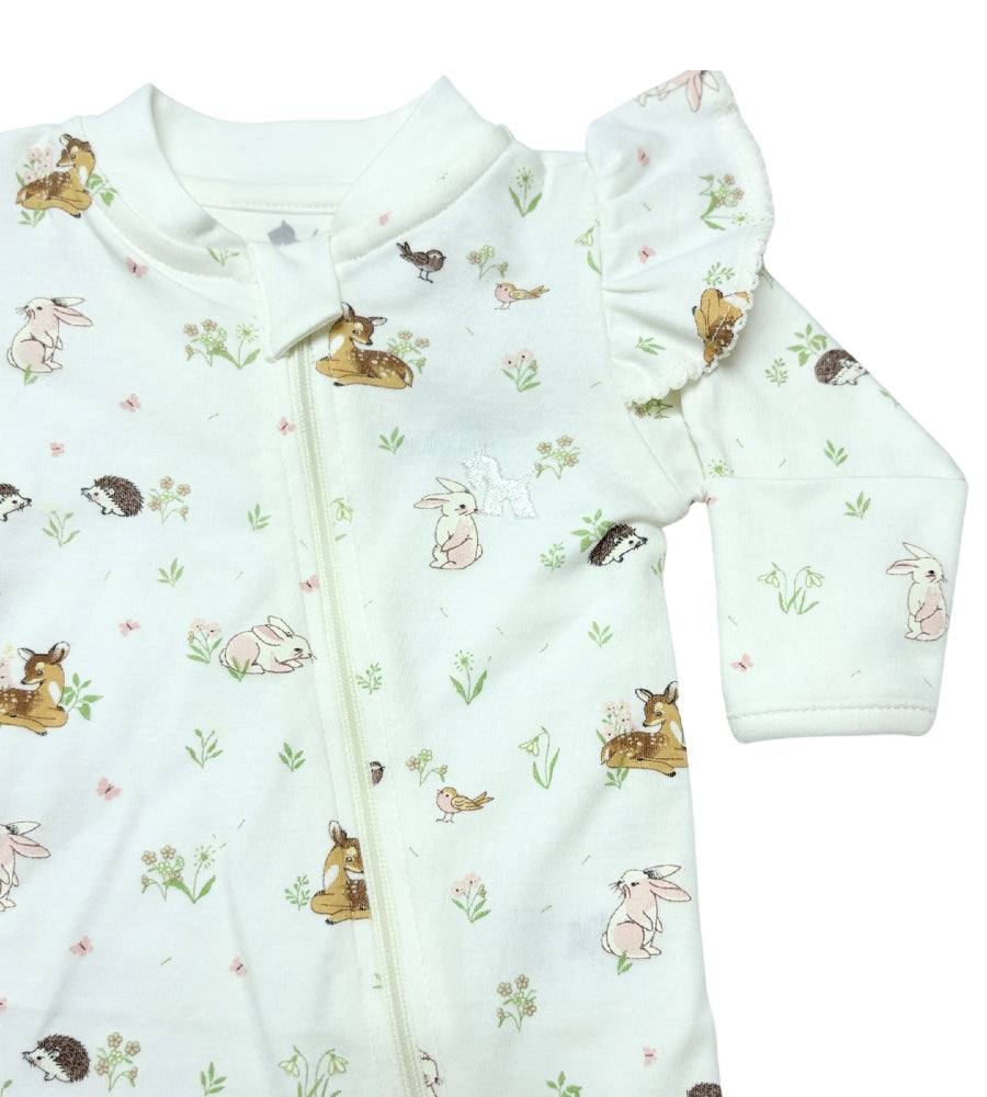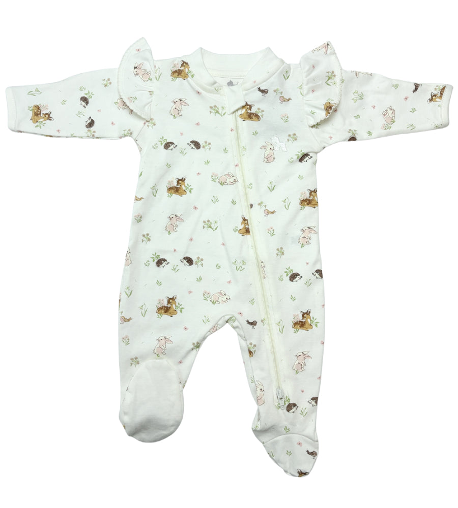 Enterito para el día o la noche con doble cierre y con piecito, (parte del cuello y en la parte del pie), que facilita la muda de los bebés , diseño Bambi fondo color hueso y con vuelito en los hombros que le da el toque femenino.