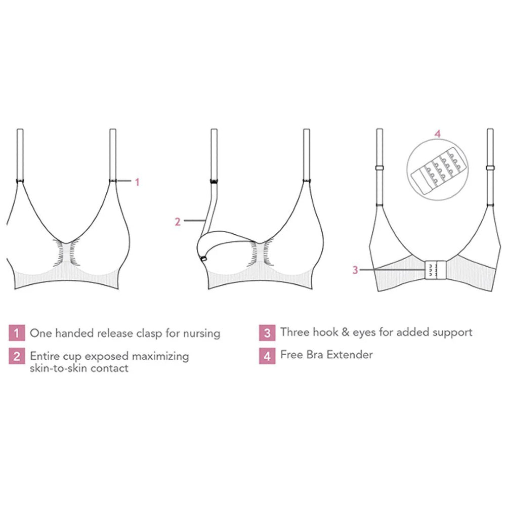 Este es un sostén suave y cómodo que se amolda a la forma de tu cuerpo cambiante. Sus broches para lactancia se abren con una sola mano y fácilmente  expone todo el pecho maximizando el contacto piel con piel entre tu y tu bebé.